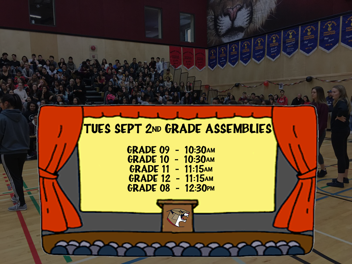 All students in Grades 9 through 12 are required to attend a mandatory Welcome Back Assembly in the Large Gym. Attendance is compulsory. Please see schedule below. - Grade 8: